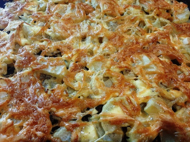 Для приготовления гратена понадобится: грудинка свиная или другое мясо, обязательно с жирком, отварные сморчки, картофель, лук репчатый, майонез, сыр, черный молотый перец, соль, сахар, растительное масло.